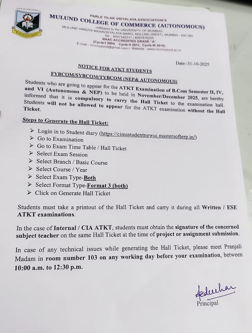 NOTICE-ATKT STUDENTS-HALL TICKET
