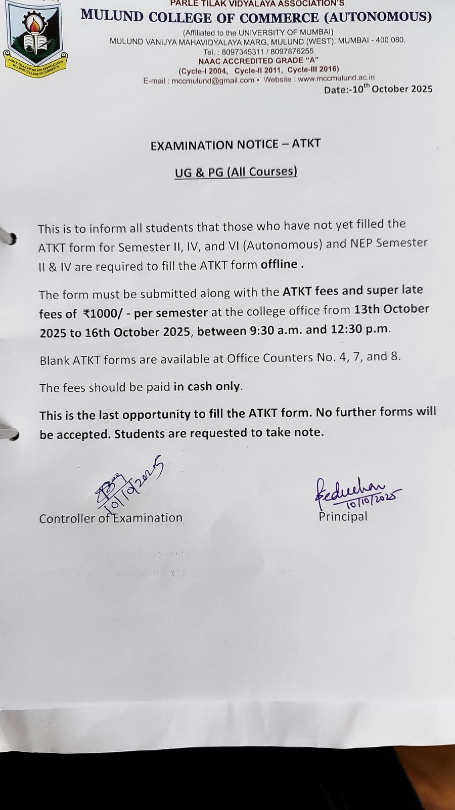 ATKT NOTICE FOR BCOM DEGREE COLLEGE FOR AUTONOMOUS II,IV AND VI NOV 2025