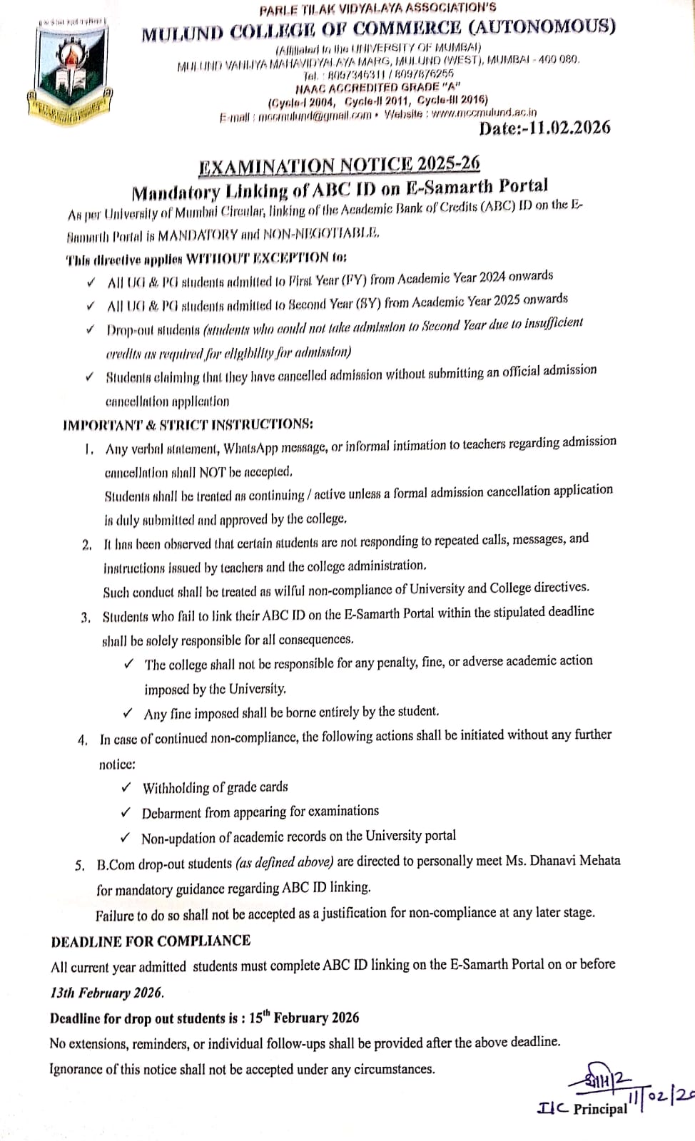 ATKT NOTICE FOR BCOM DEGREE COLLEGE FOR AUTONOMOUS II,IV AND VI NOV 2025